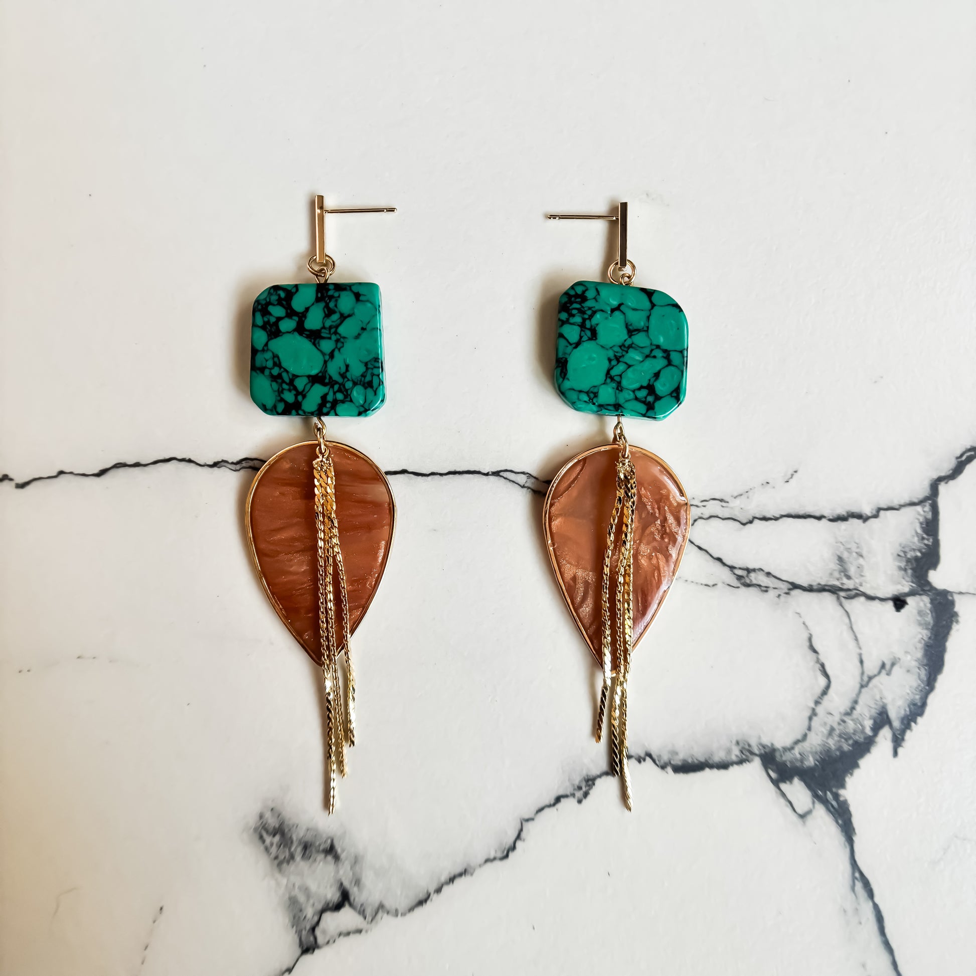 Add a bold yet elegant touch to your look with these handcrafted turquoise and blush dangle earrings. Featuring a marbled blush polymer clay teardrop framed in gold and paired with a vibrant faux turquoise stone, these statement earrings are finished with delicate gold chain fringe for effortless movement. Lightweight and eye-catching, they’re the perfect boho earrings for everyday wear or special occasions.