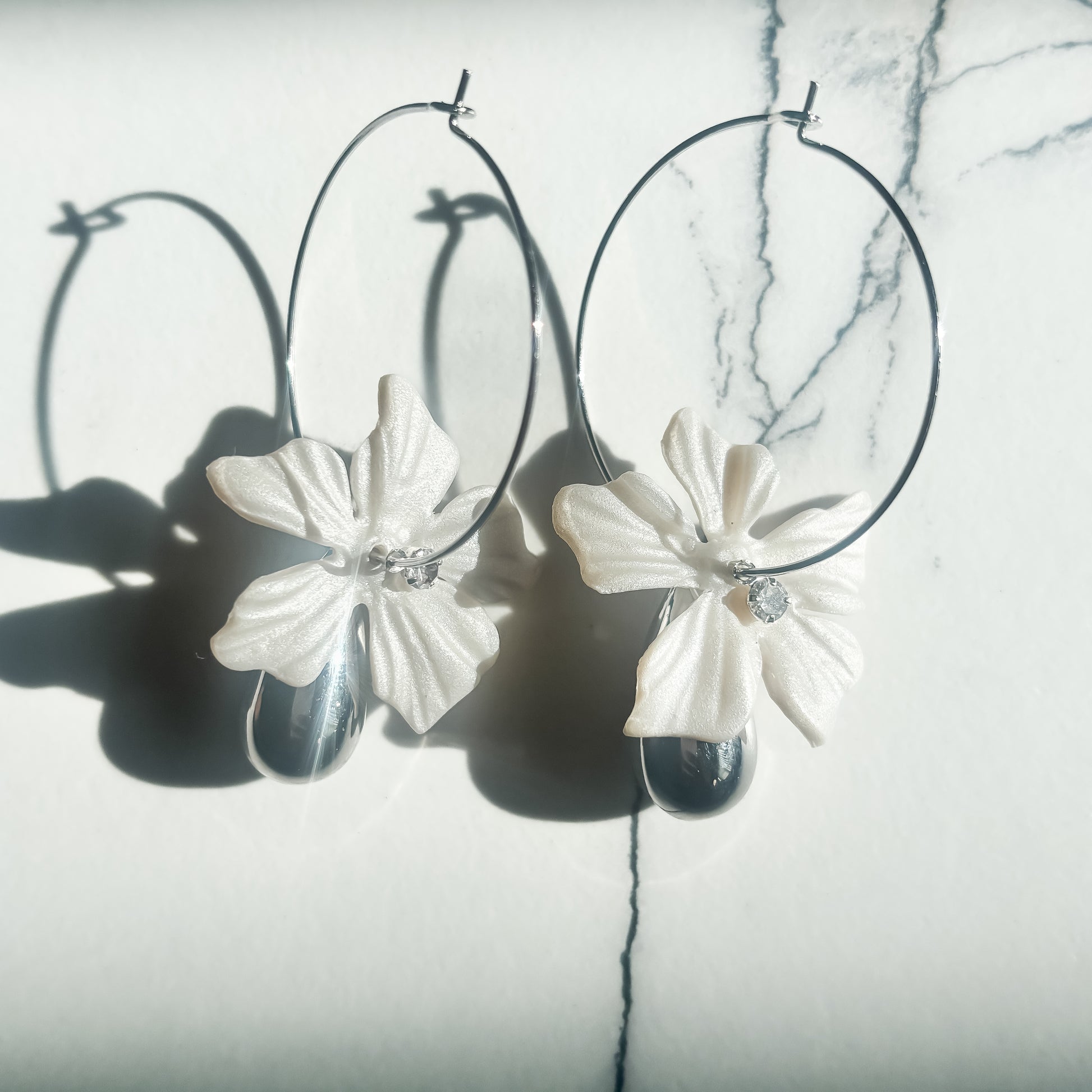 The Mariah Earrings are a delicate balance of romance and refined edge. Featuring a hand-sculpted translucent flower, a sparkling cubic zirconia center, and a metallic teardrop charm that mirrors the finish of your chosen hoop—these earrings embody modern femininity.